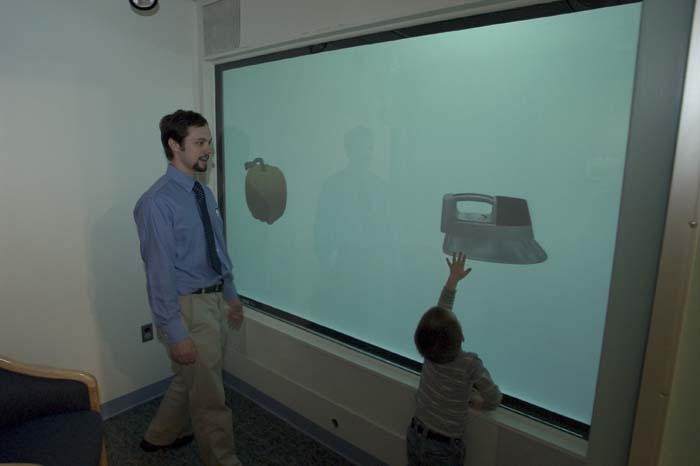 Children can interact with our large screen during our language studies! In the “dax” studies, we are coming to understand how children infer the meaning of new words.